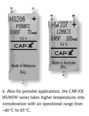 同樣針對緊湊空間設計但可耐更高溫度的CAP-XX公司HS和HW係列電容器具有很薄的外殼,工作溫度範圍是-40℃到85℃(圖6)。在4.5到5.5V電壓範圍內,HW的尺寸為28.5x17mm。在5.5V電壓時的電容量可達0.4F,ESR在5.5V時可低至100mΩ。