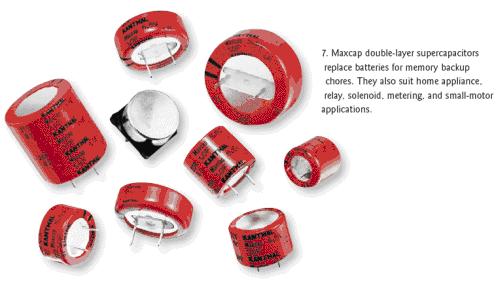 KanthalGlobar公司的Maxcap雙層電容器可以用來代替作為存儲器後備電源的電池,具有超過5.5F/in.3的容積效率、無限的服務壽命、快速充放電能力和非常低的漏電流等特性(圖7)。KanthalGlobar公(gong)司(si)還(hai)表(biao)示(shi),這(zhe)些(xie)電(dian)容(rong)比(bi)電(dian)池(chi)更(geng)安(an)全(quan),在(zai)短(duan)路(lu)時(shi)不(bu)會(hui)爆(bao)炸(zha),也(ye)不(bu)會(hui)損(sun)壞(huai)。這(zhe)些(xie)電(dian)容(rong)器(qi)是(shi)非(fei)極(ji)化(hua)器(qi)件(jian),不(bu)需(xu)要(yao)限(xian)流(liu)電(dian)阻(zu)或(huo)過(guo)壓(ya)保(bao)護(hu),因(yin)而(er)可(ke)以(yi)消(xiao)除(chu)裝(zhuang)配(pei)錯(cuo)誤(wu)和(he)相(xiang)關(guan)的(de)成(cheng)本(ben)。