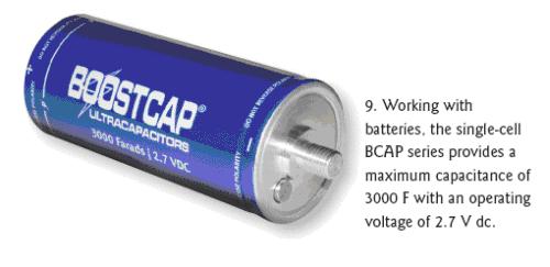 MaxwellTechnologies公司還有許多大型的具有很高容量的BOOSTCAP品牌單節電容器,不過工作電壓比較低。BCAP係列共5節,在2.7Vdc的工作電壓下電容值可達650、1200、11500、2000和3000F(圖9)。這些電容的主要用途是與電池並行工作,適合要求恒定低功率放電以及峰值負載下提供脈衝功率的應用。