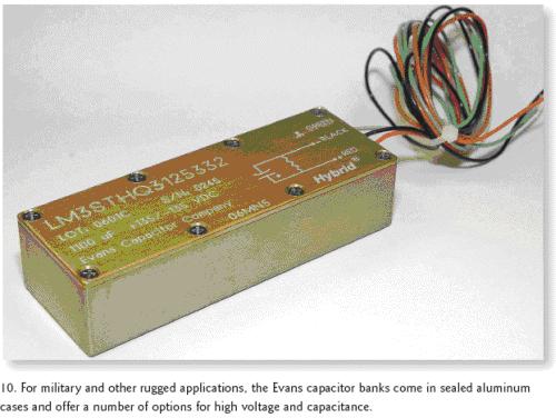 [page]EvansCapacitor公司的3STHQ3和3PTHQ3電容組器件則主要用於任務繁重的軍事應用,它將公司的三個THQ3混合電容集成進了一個陽極電鍍、環氧密封的鋁殼中,整個尺寸為4.47×1.59×1.09英寸(圖10)。針對更高的工作電壓,3STHQ3組可以串聯電容的方式提供以下四種產品:0.004F/160Vdc,0.0028F/200Vdc,0.0019F/250Vdc和0.0011F/300Vdc。