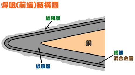 一般焊咀結構,內部主要由銅製成,外麵會鍍上鐵(鍍鐵層),而鍍鐵層前端會鍍上錫(鍍錫層),後hou端duan則ze會hui鍍du上shang抗kang氧yang化hua的de鉻ge。由you於yu錫xi和he鐵tie同tong樣yang屬shu於yu高gao活huo動dong性xing的de金jin屬shu,所suo以yi他ta們men很hen容rong易yi會hui結jie合he成cheng混hun合he金jin屬shu,特te別bie是shi在zai高gao溫wen的de狀zhuang態tai下xia。而er且qie在zai焊han接jie時shi所suo使shi用yong的de助zhu焊han劑ji(特別是高活性的)亦是加速他們產生混合金屬反應的催化劑。