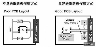 (圖一) TVS二極管的箝位效能可以透過將元件安排在接近輸出入連接點,並將連接TVS的走線長度縮短而提高。