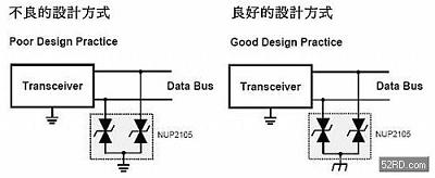 如果可能,保護線路應該將突波電壓並聯到參考點或者是機殼的接地上,如(圖二)所示。將突波電壓直接並聯到晶片的信號接地點會造成接地彈跳現象,在單一接地的印刷電路板上,TVS二極管的箝位效能可以透過利用相對較短且幅度較寬的接地走線將阻抗降到最低來加以改善。