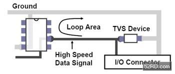 幅(fu)射(she)噪(zao)音(yin)與(yu)受(shou)射(she)頻(pin)信(xin)號(hao)影(ying)響(xiang)的(de)問(wen)題(ti)可(ke)以(yi)透(tou)過(guo)盡(jin)可(ke)能(neng)縮(suo)減(jian)由(you)高(gao)速(su)資(zi)料(liao)與(yu)接(jie)地(di)線(xian)所(suo)形(xing)成(cheng)的(de)迴(迴)路(lu)區(qu)大(da)小(xiao)來(lai)降(jiang)低(di),一(yi)個(ge)解(jie)決(jue)迴(迴)路(lu)區(qu)最(zui)小(xiao)化(hua)問(wen)題(ti)的(de)有(you)效(xiao)方(fang)法(fa)是(shi)在(zai)印(yin)刷(shua)電(dian)路(lu)板(ban)設(she)計(ji)上(shang)加(jia)入(ru)接(jie)地(di)麵(mian),特(te)別(bie)是(shi)在(zai)走(zou)線(xian)長(chang)度(du)相(xiang)對(dui)較(jiao)長(chang)時(shi),雖(sui)然(ran)將(jiang)TVS元件與晶片間的距離盡量加大可以提供隔離,但卻可能增加回路區的麵積大小,請參考(圖三)。