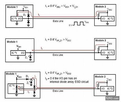 突崩式TVS二(er)極(ji)管(guan)雖(sui)然(ran)擁(yong)有(you)高(gao)突(tu)波(bo)規(gui)格(ge),但(dan)相(xiang)對(dui)較(jiao)大(da)的(de)電(dian)容(rong)值(zhi)使(shi)得(de)這(zhe)類(lei)元(yuan)件(jian)成(cheng)為(wei)負(fu)載(zai)切(qie)換(huan)開(kai)關(guan)與(yu)直(zhi)流(liu)電(dian)源(yuan)彙(hui)流(liu)排(pai)保(bao)護(hu)應(ying)用(yong)的(de)較(jiao)佳(jia)選(xuan)擇(ze),相(xiang)反(fan)地(di),二(er)極(ji)管(guan)陣(zhen)列(lie)適(shi)當(dang)的(de)突(tu)波(bo)規(gui)格(ge)與(yu)較(jiao)小(xiao)的(de)電(dian)容(rong)值(zhi)則(ze)較(jiao)適(shi)用(yong)於(yu)高(gao)速(su)資(zi)料(liao)連(lian)接(jie)線(xian)的(de)保(bao)護(hu),突(tu)崩(beng)式(shi)TVS與二極管陣列通常可以交互使用,但部份電路在選擇適合採用的元件時則需要經過仔細的分析。(圖四)描述了當存在一個電流可以透過資料線流經二極管陣列路徑時所發生的向後驅動問題,如果VDD2大於VDD1,那麼資料連接線有可能意外地提供電源給模組1,這個情況可能會造成邏輯晶片的電源啟動問題,或是在斷電後模組1上指示燈被點亮的異常狀況。
