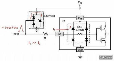 理想的外加TVSyuanjianyinggainenggouxishousuoyoutubomaichongdenengliang,danshizaishijishangzeburan,bufendetubodianliunengliangkenenghuitongguojingpianneibudebaohudianlu,yigexianzhidianliuliuruneibubaohudianludefangfashishiyongyikechuanjiedianzu,ru(圖六)。雖然內部保護電路在避免組裝時發生ESDshixiaodebiaoxianshangxiangdanglianghao,danbaohuyuanjianxiangduijiaoxiaodechicunzexianzhiletamenchengshouzhengchangchanpinshiyongqingzhuangxiasuofashengtuboxinhaodenengli,lingyifangmian,suiranerjiguandetubochulinengliyutijichengzhengbi,dantongchangzaijingpianzhongzhenghejiaodaxingdebaohuyuanjianbingbushiji。