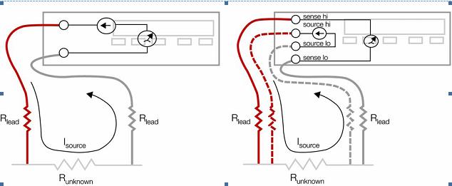 源端引線中的串聯電阻不影響電流流動。測量/傳感引線幾乎沒有電流流動,因為儀表的輸入阻抗很高。這意味著測量引線中沒有I x R電壓下跌。因此,您隻需測量由於流經的源電流而在未知電阻器中產生的電壓下跌。