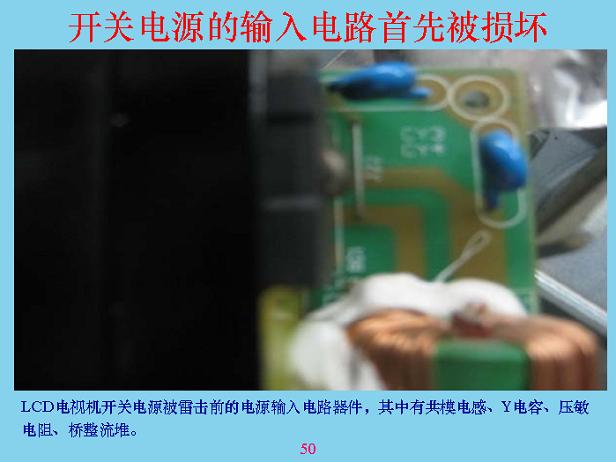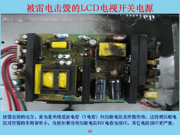 下xia麵mian我wo們men講jiang一yi些xie具ju體ti的de。這zhe是shi一yi個ge開kai關guan電dian源yuan,開kai關guan電dian源yuan被bei雷lei劈pi的de時shi候hou,輸shu入ru回hui路lu基ji本ben上shang都dou燒shao了le,假jia如ru沒mei燒shao是shi什shen麼me樣yang的de?可ke以yi看kan看kan,這zhe是shi橋qiao堆dui,這zhe兩liang個ge是shiY電dian容rong,這zhe裏li麵mian還hai有you一yi個ge壓ya敏min電dian阻zu。這zhe是shi共gong模mo線xian圈quan,雷lei劈pi以yi後hou全quan部bu燒shao了le,說shuo明ming壓ya敏min電dian阻zu沒mei有you起qi到dao什shen麼me保bao護hu作zuo用yong,兩liang個ge電dian容rong都dou燒shao了le,說shuo明ming電dian感gan相xiang當dang、相(xiang)當(dang)地(di)高(gao)。為(wei)了(le)防(fang)止(zhi)雷(lei)電(dian),首(shou)先(xian)前(qian)麵(mian)一(yi)定(ding)要(yao)加(jia)一(yi)個(ge)能(neng)量(liang)吸(xi)收(shou),比(bi)較(jiao)大(da)的(de)東(dong)西(xi),成(cheng)本(ben)相(xiang)對(dui)來(lai)說(shuo)比(bi)較(jiao)低(di),像(xiang)試(shi)驗(yan)站(zhan)裏(li)麵(mian)的(de)放(fang)電(dian)裝(zhuang)置(zhi),那(na)個(ge)東(dong)西(xi)沒(mei)有(you)地(di)方(fang)裝(zhuang),也(ye)貴(gui)得(de)很(hen)。在(zai)硬(ying)紙(zhi)板(ban)上(shang)麵(mian)排(pai)幾(ji)個(ge)鋸(ju)齒(chi),中(zhong)間(jian)隔(ge)一(yi)個(ge)頭(tou)就(jiu)行(xing)了(le)。如(ru)果(guo)中(zhong)間(jian)隔(ge)6mm也可以。有一個一級電感,電感可以使瞬間上去很快的電壓降下來,突然加一個1萬伏、10萬wan伏fu,加jia上shang去qu隻zhi有you這zhe兩liang端duan,另ling外wai兩liang端duan建jian立li不bu起qi來lai,所suo以yi剛gang加jia進jin去qu的de時shi候hou對dui雷lei電dian來lai說shuo,大da部bu分fen能neng量liang都dou被bei吸xi收shou掉diao了le。後hou麵mian經jing過guo這zhe個ge以yi後hou,剩sheng餘yu部bu分fen通tong過guo共gong膜mo電dian容rong繼ji續xu吸xi收shou,吸xi收shou完wan以yi後hou還hai有you差cha模mo部bu分fen,產chan生sheng的de差cha模mo部bu分fen通tong過guo電dian容rong把ba差cha模mo吸xi收shou掉diao。共gong模mo電dian容rong和he差cha模mo電dian容rong具ju有you抑yi製zhi傳chuan導dao幹gan擾rao的de作zuo用yong,對dui雷lei電dian也ye有you抑yi製zhi作zuo用yong,所suo以yi很hen多duo人ren也ye在zai問wen,電dian容rong接jie到dao前qian麵mian好hao還hai是shi接jie在zai後hou麵mian好hao?這zhe個ge東dong西xi看kan你ni有you什shen麼me作zuo用yong,如ru果guo隻zhi是shi為wei了le防fangEMIdianciganraodehua,jiezaiyueqianmianyuehao,jiezaiceshiyibiaodeshuruduanzuihao,jiedaonalibaxinhaoquanbuduanludiaole,jiukanbudaole。danshiduiyuleidian,nijiedaohoumianyaohaohenduo,suoyizhezhuyaoshifangleide,nijiubuyaokaolvdianciganraoheEMC了,盡量把兩個放在後麵。