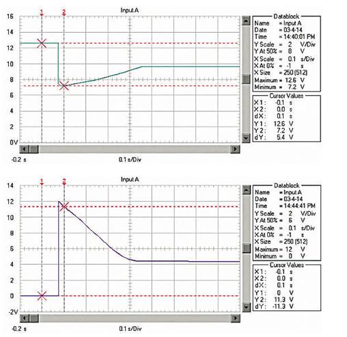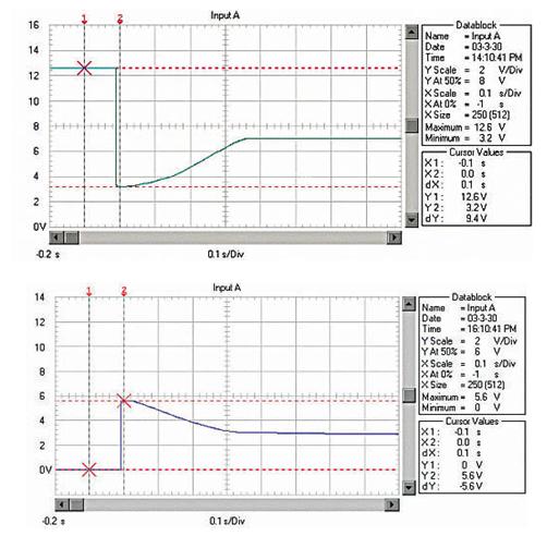 由於RM、RB、RL均非常低,啟動電流非常大。例如用12V、45Ah的蓄電池啟動安裝1.9升柴油機的汽車,蓄電池的電壓在啟動瞬間由12.6V降到約3.6V!啟動過程的蓄電池電壓波形如圖1;啟動瞬時的電流達550A,約為蓄電池的12C的放電率!啟動過程的蓄電池電流波形如圖2,(電流傳感器的電流/電壓變換比率:100A/V)。盡管車用蓄電池是啟動專用蓄電池,可以高倍率放電,但在圖1中可以看出,10倍以上的高倍率放電時的蓄電池性能變得很差,而且,如此高倍率放電對蓄電池的損傷也是非常明顯的。啟動過程的電壓劇烈變化也是極強的電磁幹擾,可以造成電氣設備的“掉電”,迫使電氣設備在發電機啟動過程結束後重新上電,計算機在這個過程中非常容易死機。因此,無論從改善汽車電氣設備的電磁環境還是改善汽車的啟動性能和蓄電池的性能、延長使用壽命來考慮,改善汽車電源在啟動過程的性能是必要的。
