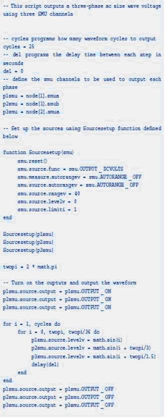 這部分包含許多腳本例子說明吉時利支持腳本的儀器的一些特點。圖1示出了兩台吉時利係統源表如何使用單腳本控製產生3相交流波形。在這個例子中,使用吉時利的TSP-Link技術連接這兩台儀器,因而很容易用腳本控製這兩台儀器。
