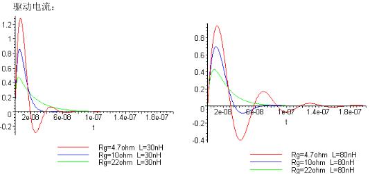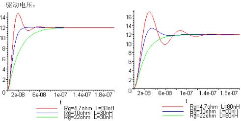 可以看到當Rg比較小時驅動電壓上衝會比較高,震蕩比較多,L越大越明顯,此時會對MOSFET及其他器件性能產生影響。但是阻值過大時驅動波形上升比較慢,當MOSFET有較大電流通過時會有不利影響。