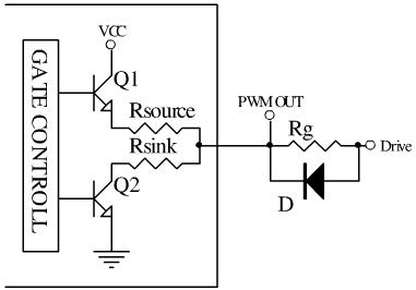 一般IC的PWM OUT輸出如左圖所示,內部集成了限流電阻Rsource和Rsink,通常Rsource>Rsink,具體數值大小同IC的峰值驅動輸出能力有關,可以近似認為R=Vcc/Ipeak。一般IC的驅動輸出能力在0.5A左右,因此Rsource在20Ω左右。