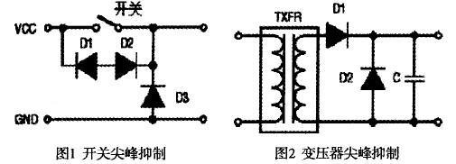 圖1中的二極管用於抑製高壓開關的尖峰電壓。圖2是典型的變壓和整流電路,D2是肖特基或齊納二極管,用於抑製濾波後的尖峰瞬態噪聲電壓。