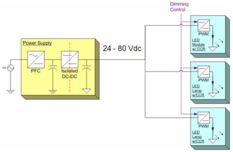 LED區域照明電源需要很多顆1 W LED來產生所要求的流明輸出(40到超過100顆),要可以調節設計以用於多種不同的光等級,此外,街燈要求特殊的光分布,對光電器件有要求。大功率LED區域照明應用中,一種常見的電源架構是“功率因數校正(PFC)+恒壓(CV)+恒流(CC)”的三段式架構。這種架構中,交流輸入電源經過功率因數校正和隔離型直流-直流(DC-DC)轉換後,輸出24至80 Vdc的固定電壓,提供給後麵內置DC-DC降壓轉換電路的恒流LED模塊(見圖2)。這種架構的設計提供了能夠現場升級的模塊化途徑,可根據實際需求,靈活改變LED光條數量,從而增加或減小光輸出,滿足具體區域照明應用要求。