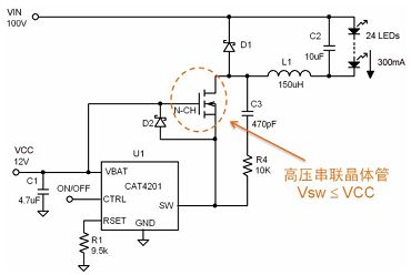 CAT4201可采用最高36 V的電源電壓供電,並兼容於12 V和24 V標準照明係統。圖4顯示的是CAT4201的高壓LED驅動器配置,外圍的N溝道MOSFET支持高壓輸入:100 V輸入電壓時LED功率達30 W;50 V輸入時LED功率達13 W。
