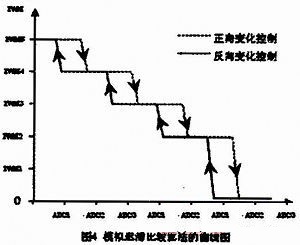 亮度感應自動控製的模擬遲滯比較算法將PWM的背光控製分成五段,四個模擬遲滯比較算法控製。每個模擬遲滯比較器有兩個閾值ADC值,分別稱為正向閾值ADC和負向閾值ADC。在環境亮度輸入信號從低電平(暗)上升到高電平(亮)的過程中使PWM電路狀態發生變化的輸入ADC稱為正向閾值ADC,在輸入信號從高電平(亮)下降到低電平(暗)的過程中使PWM電路狀態發生變化的輸入ADC稱為負向閾值ADC。例如ADC2是正向閾值ADC,ADC1是負向閾值ADC,在環境亮度輸入信號從ADCI低電平(暗)上升到ADC2高電平(亮)的過程中,使PWM狀態由PWN5轉變為PWM4;在環境亮度輸入信號從ADC2高電平(亮)下降到ADC1低電平(暗)的過程中,使PWM狀態由PWN4轉變為PWM5。這樣設計成阻止環境亮度輸入信號出現微小變化(低於某一閾值ADC)而引起輸出PWM的改變,確保穩定的液晶麵板背光控製。如圖4亮度感應自動控製的模擬遲滯比較算法的曲線圖所示。