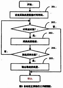 亮度感應自動控製的自動校正算法的步驟:首先設定采集亮度數據的時間間隔以及設定采樣次數;當時間間隔定時到時,讀取光感應器亮度的數據;當采樣次數到達預設次數後,輸出穩定的亮度;再由CPU輸出穩定的PWM,去控製液晶麵板的背光。設定采集亮度數據時間間隔201是初始化每次采集光感應器亮度的時間。時間定時到202是達到可以去采集光感應器亮度的時間。采集亮度數據203是CPU讀取光感應器亮度數據通過ADC的數字信號的數值。到達采樣次數204是到達采集亮度數據都一樣的次數,表示環境亮度已經穩定,不再變化。輸出穩定的亮度205是CPU輸出穩定的PWM去控製液晶麵板的背光。如圖3亮度感應自動控製的自動校正算法的工作流程所示。