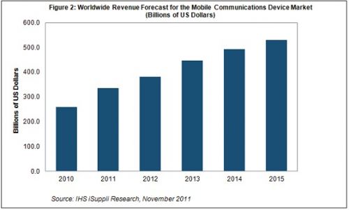 據IHS iSuppli公司的無線通信市場研究報告,智能手機和平板電腦在消費者中日益普及,今年將推動移動通信產品與無線基礎設施設備營業收入大增29%。