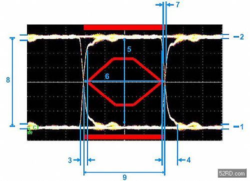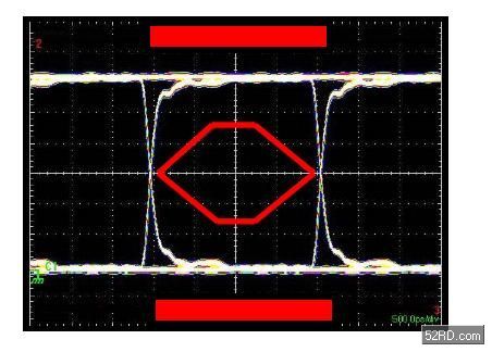 通過在示波器的垂直軸對數字信號進行反複采樣、同時采用相應數據率對水平時間掃描進行觸發來生成眼圖。所獲得的圖形看上去象眼睛,如圖1所示。“眼睛”越大,數據完整性越高。通常采用模板(mask)來對可接受的信號質量進行定義。這模板由“眼睛”中間的六角形和“眼睛”上、下的矩陣組成。如果測得的信號跡線穿越模板的邊線,那麼信號質量就不可接受。USB2.0信號模板規範由USB應用者論壇(USBIF,www.usb.org)提供,可參見USB2.0版規範第7.1.2.2章節。圖1中顯示了帶有詳細臨界點的眼圖。