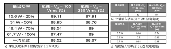 表 1:基於 NCP1250 的 65 W 演電源適配器演示板能效測試結果。