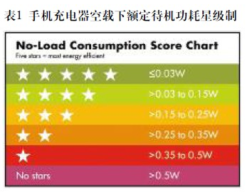 這(zhe)些(xie)關(guan)注(zhu)的(de)結(jie)果(guo)是(shi)采(cai)取(qu)一(yi)係(xi)列(lie)措(cuo)施(shi)來(lai)提(ti)升(sheng)效(xiao)率(lv)和(he)降(jiang)低(di)空(kong)載(zai)功(gong)耗(hao)的(de)需(xu)求(qiu)。其(qi)中(zhong)最(zui)新(xin)最(zui)嚴(yan)格(ge)的(de)是(shi)由(you)全(quan)球(qiu)前(qian)五(wu)大(da)手(shou)機(ji)廠(chang)商(shang)提(ti)出(chu)的(de)一(yi)項(xiang)自(zi)願(yuan)性(xing)的(de)充(chong)電(dian)器(qi)星(xing)級(ji)製(zhi)協(xie)定(ding),用(yong)以(yi)標(biao)誌(zhi)在(zai)充(chong)電(dian)完(wan)成(cheng)之(zhi)後(hou),充(chong)電(dian)器(qi)仍(reng)插(cha)在(zai)壁(bi)式(shi)插(cha)座(zuo)上(shang)時(shi)的(de)耗(hao)能(neng)量(liang)。該(gai)星(xing)級(ji)製(zhi)從(cong)0星級開始,最高5星級。空載下額定待機功耗大於0.5W的充電器為0星級標簽,待機功耗小於0.03W(30mW)的為5星級(見表1)。通過比較,大多數現有手機的待機功耗在150~300mW範圍。