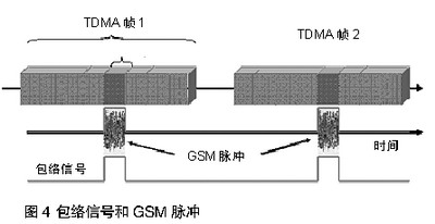 特定的手機隻在屬於它的時間空當發射。包絡信號的基本頻率是1/4.615 ms=217Hz。諧波頻率為434Hz、651Hz等。如此頻率是聽得到的。如圖4所示,為手機的包絡信號。