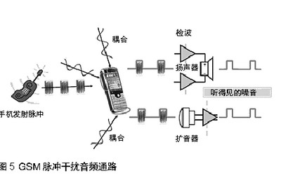 當手機與基站通訊,或兩個手機彼此接近時,發射脈衝通過擴音器,揚聲器,或頭戴式耳機線傳人音頻通路。見圖5。