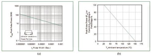 對瞬變電壓的吸收功率(峰值)與瞬變電壓脈衝寬度間的關係。手冊給的隻是特定脈寬下的吸收功率(峰值),而實際線路中的脈衝寬度則變化莫測,事前要有估計。對寬脈衝應降額使用。
