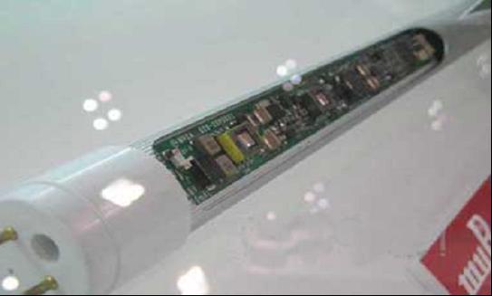 參考展示Clear Sodick生產的直管型LED照明產品,管內內置了電源電路,相當於40W熒光燈的產品的耗電量為19W,LED元件數量為204個。