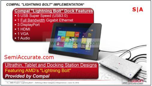 Lightning Bolt由三部分組成,分別是線纜、特殊的底座及筆記本之類的終端,聽起來很複雜,但其實Lightning Bolt使用的也是標準的DP接口,理論上甚至能支持雷電接口。雖然隻有一條DP通道,但是用它就可以連接Eyefinity多屏輸出以及5個USB 3.0接口,這也是Lightning Bolt接口在平板及超級本這樣缺少空間提供又大量接口的設備上存在的意義。