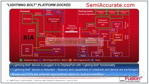 從硬件層麵上看,Lightning Bolt其實很簡單,驅動級的硬件兼容性使得芯片上的USB通道及APU上的DP通道用一條線纜就可以連接起來並輸出到hub上。