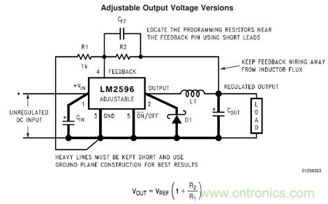DC-DC開關穩壓電路由於其高效率、大電流的優點被廣泛使用。可調DC-DC可以通過調節反饋分壓電阻來調節輸出電壓。圖1是常用DC-DC降壓穩壓芯片LM2596-Adj的典型應用電路,通過調節R1和R2就可以得到所需輸出電壓。