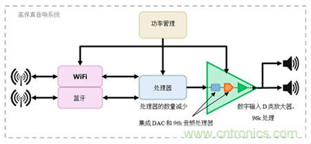 處理器執行各種音頻處理功能,如解碼和信號均衡,同時也處理Wi-Fi和/或藍牙通信軟件堆棧。過去,CD品質的采樣頻率可能已足夠。但是今天的高保真音頻係統對信號鏈中的處理器提出了其它要求,因為高保真音質要求在24位音樂信號流中提供48kHz至192kHz範圍內的采樣率。