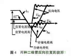 圖4是存儲電荷高或低的兩種二極管電流、電dian壓ya波bo形xing。從cong圖tu中zhong可ke以yi看kan出chu存cun儲chu電dian荷he少shao時shi,反fan向xiang電dian壓ya的de斜xie率lv大da,並bing且qie會hui產chan生sheng有you害hai的de振zhen動dong。而er前qian置zhi電dian流liu低di則ze存cun儲chu電dian荷he少shao,即ji在zai空kong載zai或huo輕qing載zai時shi是shi最zui壞huai條tiao件jian。所suo以yi進jin行xing優you化hua驅qu動dong電dian路lu設she計ji時shi應ying著zhe重zhong考kao慮lv前qian置zhi電dian流liu低di的de情qing況kuang,即ji空kong載zai或huo輕qing載zai的de情qing況kuang,應ying使shi這zhe時shi二er極ji管guan產chan生sheng的de振zhen動dong在zai可ke接jie受shou範fan圍wei內nei。