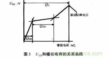 柵極電荷QG包含了兩個部分:柵極到源極電荷QGS;柵極到漏極電荷QGD—即“Miller”電荷。QGS是使柵極電壓從0升到門限值(約3V)所需電荷;QGD是漏極電壓下降時克服“Miller”效應所需電荷,這存在於UGS曲線比較平坦的第二段(如圖5所示),此時柵極電壓不變、柵極電荷積聚而漏極電壓急聚下降,也就是在這時候需要驅動尖峰電流限製,這由芯片內部完成或外接電阻完成。實際的QG還可以略大,以減小等效RON,但是太大也無益,所以10V到12V的驅動電壓是比較合理的。這還包含一個重要的事實:需要一個高的尖峰電流以減小MOS管損耗和轉換時間。