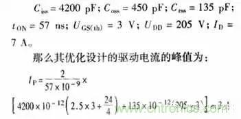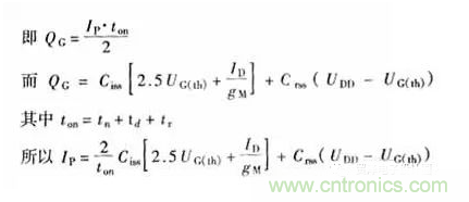 UGS第一段是快速上升到門限電壓;UGS第二段是比較緩的上升速度以減慢漏極電流的上升速度,但此時的UGS也必須滿足所需的漏極電流值;UGS第四段快速上升使漏極電壓快速下降;UGS第di五wu段duan是shi充chong電dian到dao最zui後hou的de值zhi。當dang然ran,要yao得de到dao完wan全quan一yi樣yang的de驅qu動dong波bo形xing是shi很hen困kun難nan的de,但dan是shi可ke以yi得de到dao一yi個ge大da概gai的de驅qu動dong電dian流liu波bo形xing,其qi上shang升sheng時shi間jian等deng於yu理li想xiang的de漏lou極ji電dian壓ya下xia降jiang時shi間jian或huo漏lou極ji電dian流liu上shang升sheng的de時shi間jian,並bing且qie具ju有you足zu夠gou的de尖jian峰feng值zhi來lai充chong電dian開kai關guan期qi間jian的de較jiao大da等deng效xiao電dian容rong。該gai柵zha極ji尖jian峰feng電dian流liuIP的計算是:電荷必須完全滿足開關時期的寄生電容所需。