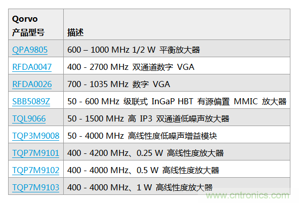 Qorvo 的小信號產品係列線性度高,功耗低,噪音小,尺寸小,極其便於集成。這一係列包括發送線性放大器、增益模塊和可變增益放大器,以及衰減器、開關、濾波器、雙工器和低噪聲放大器。少數此類解決方案包含: