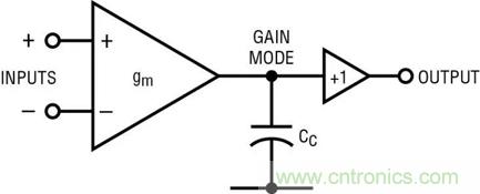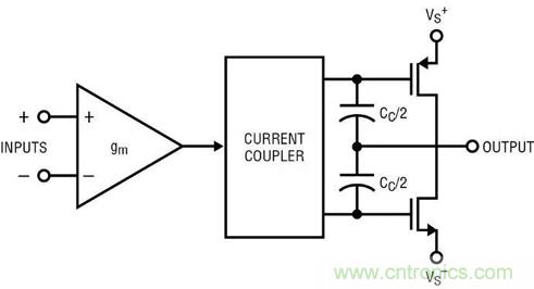 圖 1a 顯示了一個非軌至軌放大器的方框圖。輸入控製 gm 方框,gm 方框驅動增益節點,並在輸出端得到緩衝。補償電容器 Cc 是主要的頻率響應組件。Cc 的返回引腳應該接地,如果有這樣一個引腳的話;但是運算放大器傳統上不接地,電容器電流會返回一個或兩個電源。圖 1b 是最簡單的軌至軌輸出放大器的方框圖。輸入方框 gm 的輸出電流通過“電流耦合器”發送,這將驅動電流分成兩部分,提供給輸出晶體管。頻率響應由兩個 Cc/2s 決定,二者實際上是並聯的。