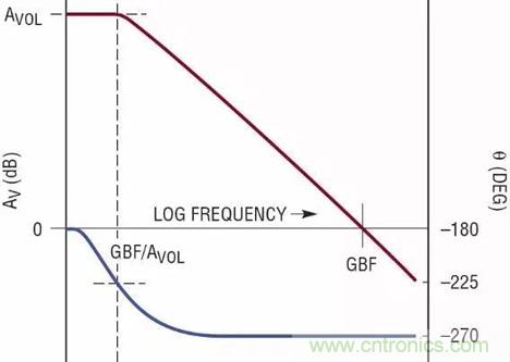 以上兩種拓撲代表了絕大多數使用外部反饋的運算放大器。圖 1c 顯示了我們的理想放大器的頻率響應,盡管兩個電路的電氣原理不同,但行為表現卻類似。由 gm 和 Cc 形成的單極點補償提供 GBF = gm/(2πCc) 的單位增益帶寬積頻率。在 GBF/Avol 附近,這些放大器的相位滯後從 –180° 降至 –270°,其中 Avol 是放大器開環 DC 增益。當頻率遠高於這個低頻率時,相位就一直停在 –270° 上。這就是為人熟知的“主極點補償”,其中 Cc 極點主導頻率響應,隱藏了有源電路的各種頻率限製。
