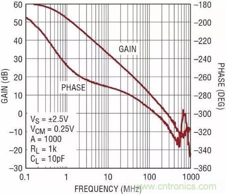 圖 2 顯示了 LTC6268 放大器隨頻率變化的開環增益和相位響應。LTC6268是一款小巧的小型低噪聲 500MHz 放大器,具軌至軌輸出和僅 3fA 偏置電流,可以作為一個很好的例子來說明真實放大器的行為表現。主極點補償的 –90° 相位滯後約從 0.1MHz 開始,在 8MHz 左右達到 –270°,超過 30MHz 時則下移超過 –270°。實shi際ji上shang,除chu了le由you於yu額e外wai增zeng益yi級ji和he輸shu出chu級ji所suo引yin起qi的de基ji本ben主zhu導dao補bu償chang滯zhi後hou之zhi外wai,所suo有you的de放fang大da器qi都dou具ju有you高gao頻pin相xiang位wei滯zhi後hou。通tong常chang,額e外wai相xiang位wei滯zhi後hou的de起qi點dian在zai GBF/10 左右。
