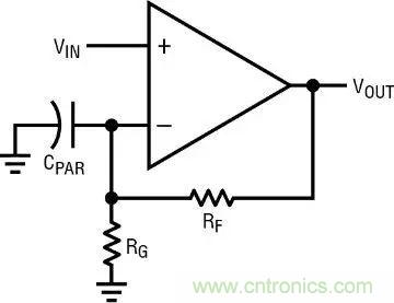 電流反饋放大器的負輸入實際上是一個緩衝器輸出,也將展現圖 8 所示的一係列特點。因此,該輸入就像一個輸出一樣,可能靠著 Cpar 產生自振蕩。Cpar 和任何有關的電感都必須最大限度減小。不幸的是,減震器在負輸入端會隨著頻率變化改變閉環增益,因此不實用。