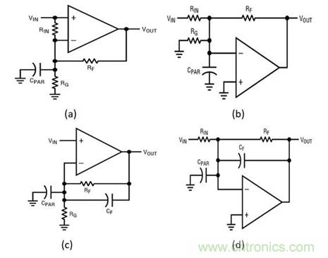 這裏依次列舉一些有關電流反饋放大器 (CFA) 的評論。如果圖 5a 中的放大器是一個 CFA,則“Rin”對(dui)於(yu)更(geng)改(gai)頻(pin)率(lv)響(xiang)應(ying)所(suo)起(qi)的(de)作(zuo)用(yong)甚(shen)微(wei),因(yin)為(wei)負(fu)輸(shu)入(ru)是(shi)非(fei)常(chang)低(di)的(de)阻(zu)抗(kang)並(bing)主(zhu)動(dong)地(di)拷(kao)貝(bei)正(zheng)輸(shu)入(ru)。噪(zao)聲(sheng)指(zhi)標(biao)將(jiang)略(lve)有(you)劣(lie)化(hua),而(er)且(qie)額(e)外(wai)的(de)負(fu)輸(shu)入(ru)偏(pian)置(zhi)電(dian)流(liu)實(shi)際(ji)上(shang)將(jiang)以(yi) Vos/Rin 的形式出現。同樣,就頻率響應而言,圖 5b 中的電路未被“Rg”所改變。反相輸入並不僅僅是一個虛擬地,它是一個真正的接地低阻抗,而且已經容許了 Cpar (僅限負輸出模式!)。DC 誤差類似於圖 5a 中所示的情形。圖 5c 和 5d 對於電壓輸入運放可能是優選方案,但是 CFA 完全不能容許一個沒有振蕩的直接反饋電容器。