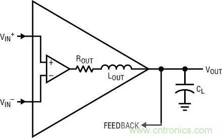 此外,任何放大器都有 20nH 至 70nH 的電生電感,尤其是雙極型器件。器件的有限 Ft 將輸出晶體管的寄生基極電阻變成電感。危害是,Lout 與 CL 可能相互作用,形成一個串聯諧振電路,那麼同樣的問題又來了,如果環路中沒有更大的相位滯後,串聯諧振電路的阻抗就可能降至 Rout 無法驅動的水平,從而可能產生振蕩。例如,設定 Lout = 60nH 和 CL = 50pF。諧振頻率
