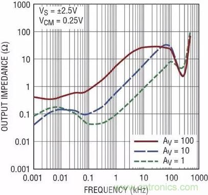 就像反饋電容可能損害相位裕度一樣,負載電容也能起到同樣的作用。圖 6 顯示在幾種增益設定值情況下,LTC6268 shuchuzukangsuipinlvdebianhua。qingzhuyi,danweizengyishuchuzukangdiyujiaogaozengyishideshuchuzukang。quanfankuishikaihuanzengyinenggoujiangdifangdaqideguyoushuchuzukang。yincitu 6 中,增益為 10 時的輸出阻抗一般是單位增益時輸出阻抗的 10 倍。由於反饋衰減器降低了環路增益,繞環路增益為 1/10,否則就會降低閉環輸出阻抗。開環輸出阻抗約為 30,這一點在增益為 100 這條曲線的高頻平坦區域很明顯。在這個區域,從增益帶寬頻率/100 左右到增益帶寬頻率,沒有足夠的環路增益來降低開環輸出阻抗。