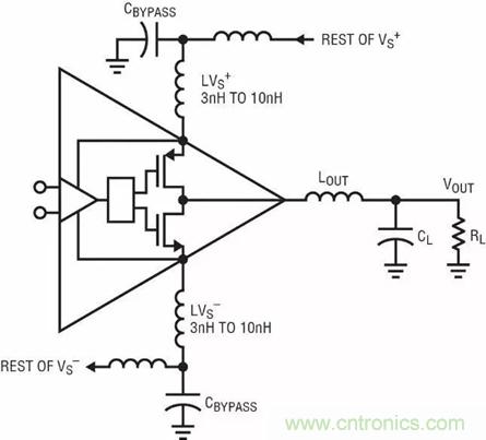 最後一個需要考慮的振蕩源是電源旁路。圖 10 顯示了輸出電路的一部分。LVS+ 和 LVS– 是不可避免的封裝、IC 接合線、旁路電容器的物理長度 (像任何導體一樣也是電感性的) 以及電路板走線的串聯電感。還包括將局部旁路組件連接到電源總線其餘部分 (如果不是電源平麵) 的外部電感。盡管 3nH 至 10nH 看起來似乎不大,但是在 200MHz 時,就是 3.8 至 j12Ω。如果輸出晶體管傳導大的高頻輸出電流,那麼在電源電感兩端會存在壓降。