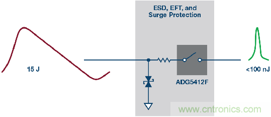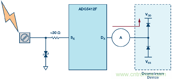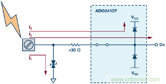 圖4也展示了高壓瞬變事件過程中的各種電流路徑。大部分電流通過TVS器件分流到地(路徑I1)。路徑I2展示的是通過ADG5412F輸出節點上的內部ESD消耗的電流,同時,輸出電壓被箝位於比電源電壓高0.7 V的水平。最後,路徑I3中的電流是下遊器件必須承受的剩餘電流水平。有關該保護電路的更多詳情,請參閱ADI公司應用筆記AN-1436。