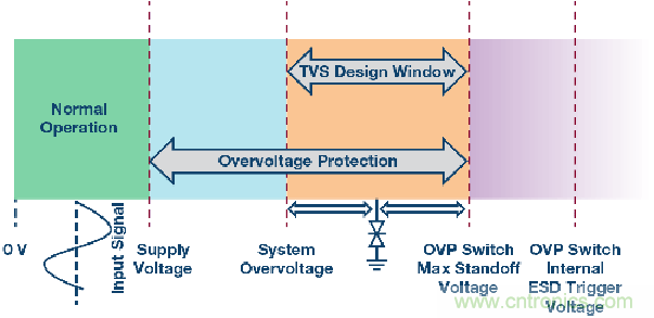 圖3顯示了一個與外部接口的係統輸入端的工作區域。最左邊的區域(綠色)表示正常工作區間,輸入電壓位於電源電壓範圍以內。左起第二個區域(藍色)表示輸入端可能存在持續直流或長時間交流過壓的範圍,原因是斷電、接線錯誤或短路。另外,圖中最右側(紫色)是過壓開關內部ESD保護二極管的觸發電壓。選擇的TVS擊穿電壓(橙色)必須小於過壓保護開關的最大承受電壓並且大於任何已知的可能持續直流或長時間交流過壓,以免無意中觸發TVS。