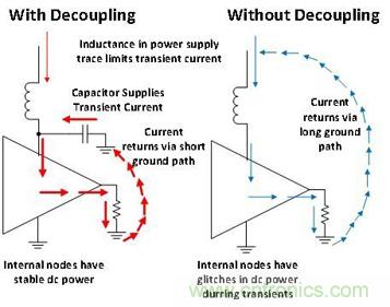 未采用去耦電容的器件無法提供暫態電流,因此放大器的內部節點會下垂(通常稱為幹擾)。無去耦電容的器件其內部電源幹擾會導致器件工作不連續,原因是內部節點未獲得正確的偏置。