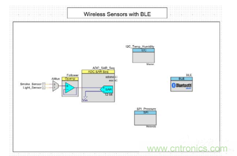 內置BLE功能的處理器的靈活性和豐富資源,使傳感器能夠與單一BLE設備連接。圖2是使用PSoC Creator的典型配置。PSoC Creator是一個用於圍繞PSoC架構開發應用程序的IDE。圖中顯示的是模擬和數字傳感器接口以及BLE子係統。該配置展示的是用於感測煙霧、光照強度、溫度、濕度和壓力的典型工業數據監測係統。配置中的每個組件都有一個關聯的應用程序編程接口(API),開發人員可根據需要訪問這些組件。每個組件還有一個與其相關的數據表對組件的可用配置進行說明。