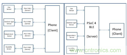 無線傳感器網絡通常作為網狀網絡和樞紐網絡(見圖1)。樞紐網絡包括可以放置在相同位置的所有傳感器。每個傳感器需要連接到單個BLE外圍設備(服務器)來處理數據並將其發送到BLE中央設備(客戶端)。網狀網絡采用可以遠程定位傳感器的拓撲結構。網格中的每個節點都需要連接到BLE外圍設備(服務器),所有這些外圍設備都可以連接到BLE中央設備(客戶端)。